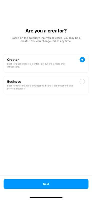 - Select ‘Switch to a professional account’ and choose ‘Creator’.